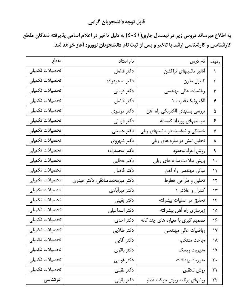 نظر به اینکه مراحل ثبت نام پذیرفته شدگان دانشجویان نوورود مقطع کارشناسی سال ۱۴۰۴ در حال انجام بوده، تا روز پنجشنبه هفته جاری تکمیل گردیده و شروع کلاسهای این دانشجویان از روز شنبه مورخ ۱۴۰۴/۰۷/۲۶ خواهد بود، خواهشمند است استادان محترم از روز شنبه در کلاسها حضور به هم رسانند.